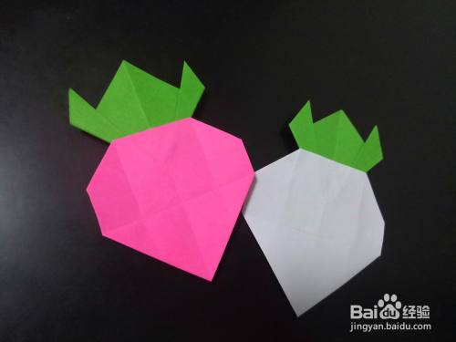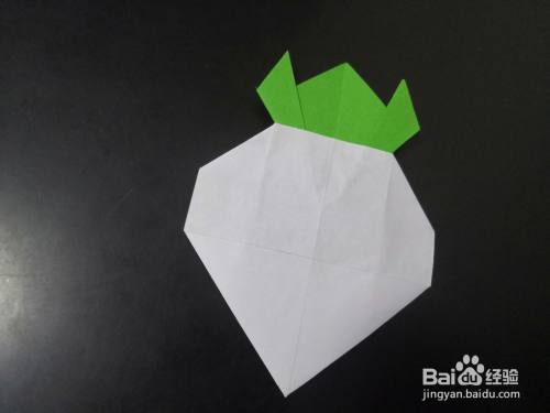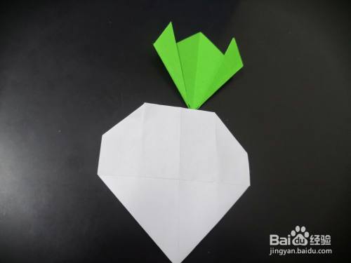 最后一步就是用固体胶将绿色的叶子和白白的萝卜粘合在一起,一个胖嘟嘟的大萝卜就折好了。