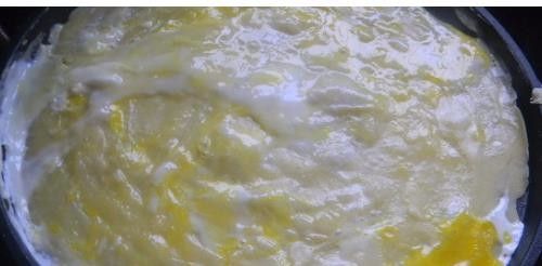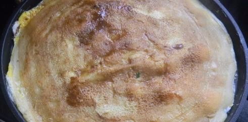 6.预热电饼铛,舀入面糊并且迅速地摊开,然后打上鸡蛋摊匀