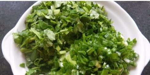 4.香葱、香菜切颗粒,火腿肠切开待用