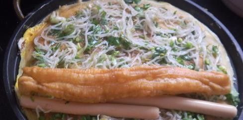 7.然后翻面,刷上一层酱料,放上豆芽、细香葱、香菜混合好