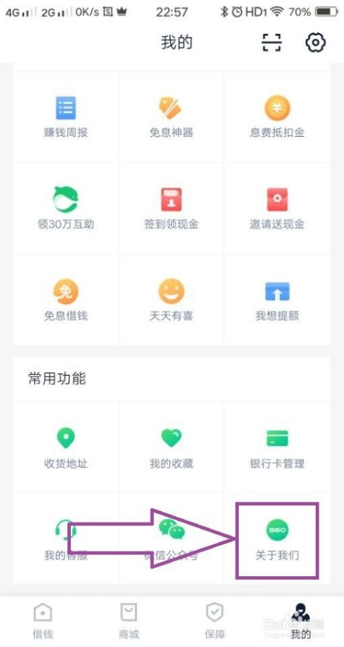 打开360借条手机APP,登录到我们的账号,然后进入到我的页面,在页面上可见“关于我们”,