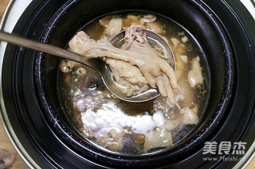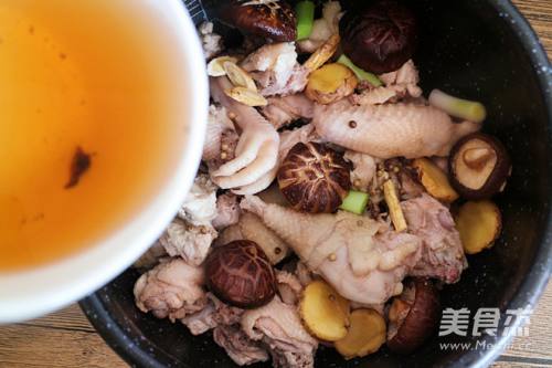 4把泡花菇的水也倒进煲里,底部沉淀的黑色杂质不要。