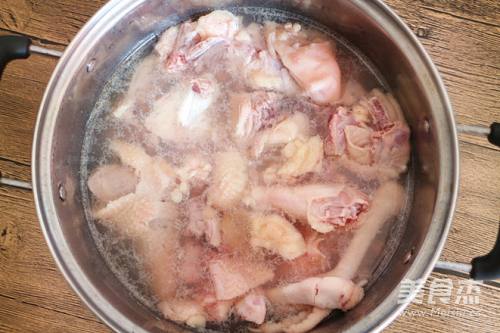 2汤锅中加入适量清水,放入鸡块,大火烧开后,煮几分钟,至鸡肉变色,撇去浮沫,把鸡肉捞出。