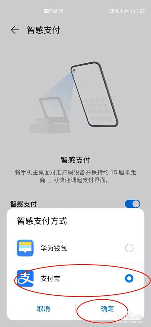 最后选择智感支付方式为支付宝,点击“确定”保存。