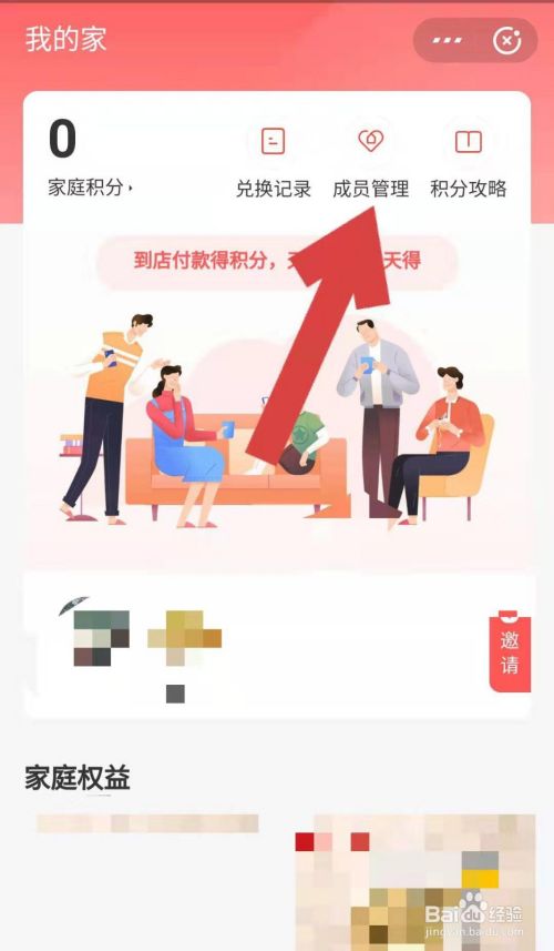 进入支付宝会员我的家页面后,点击如下图所指位置的“成员管理”,进入我的家成员管理页面。