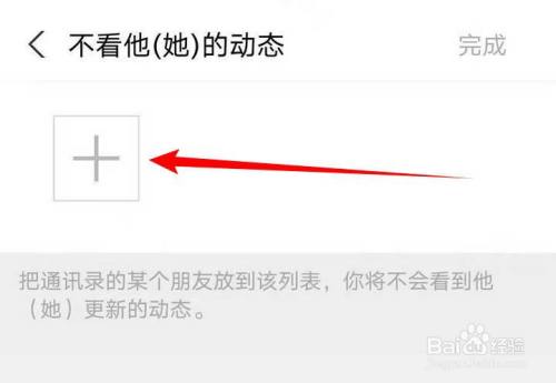 在不看他(她)的动态页面,点选“+”,在好友列表,搜索好友或点选右侧方框,再点选确定,回到上一页面,点选完成;