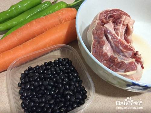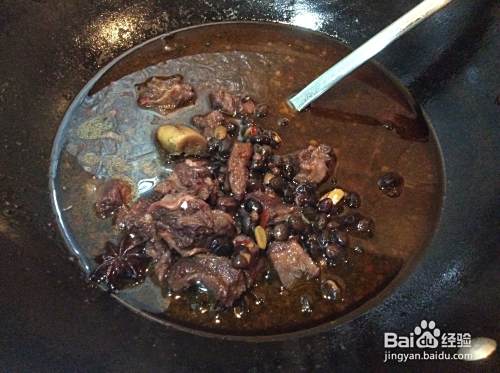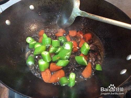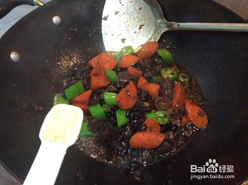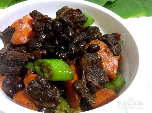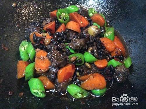 准备食材:黑豆、牛肉、红萝卜、青椒、豆瓣酱、酱油、生姜、花椒、八角、冰糖、盐、鸡精