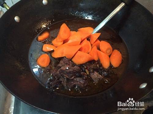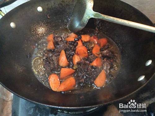 待黑豆和牛肉烧软后,全部倒进炒锅,开火,加入红萝卜,翻匀,盖上锅盖继续烧8分钟左右,红萝卜就烧软了。