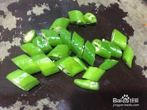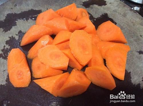 烧黑豆牛肉的期间,将红萝卜去皮洗净后切成滚刀块;青椒洗净切成1.5厘米左右长的段。