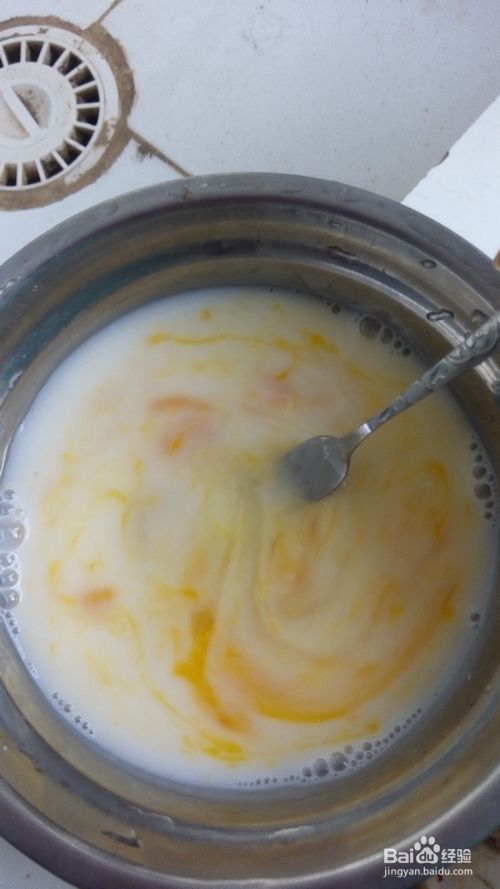 准备适量鲜牛奶倒入碗中。并打入一个鸡蛋。