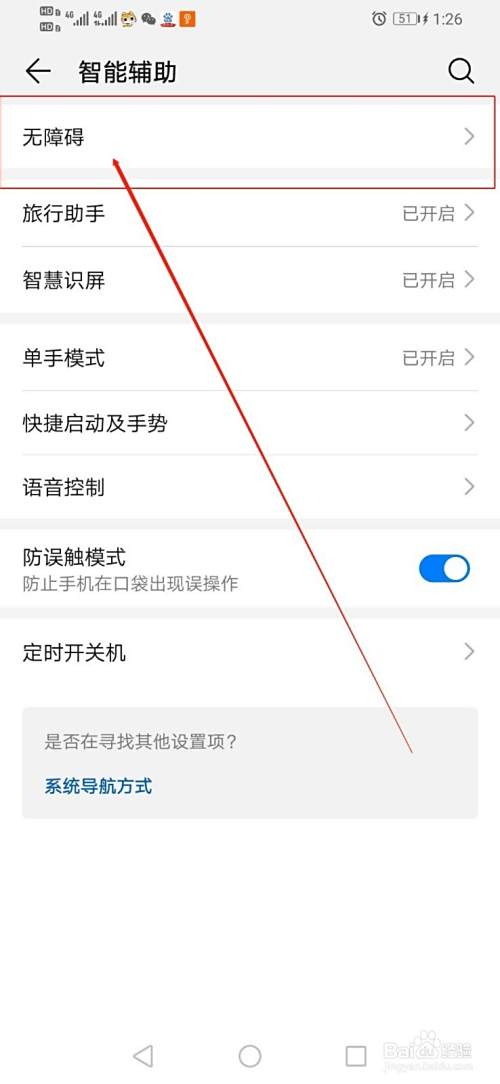 点开“智能辅助”之后,在该界面找到“无障碍”,如图