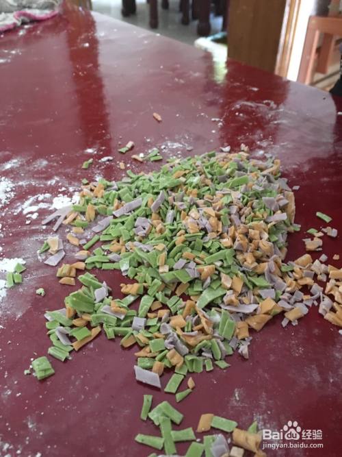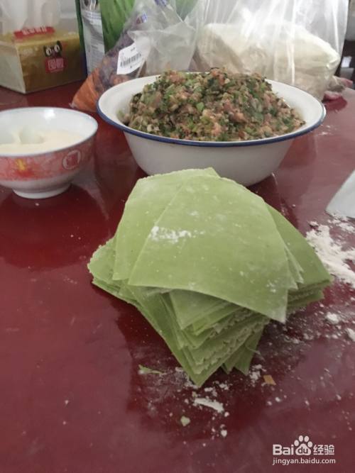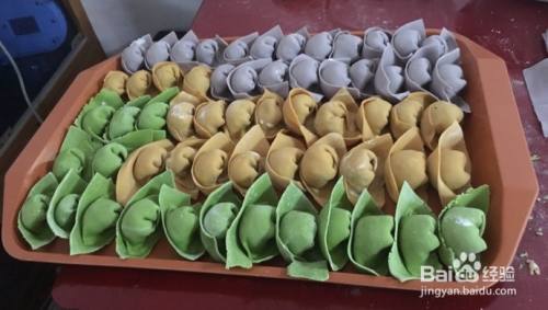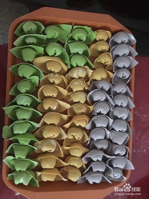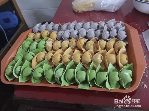 准备适量面粉,分别使用榨好的蔬菜汁,和面。面粉和水的比例大约为5:1,然后用压面机反复压,最后压成宽的长条,叠整齐后,用刀切成上窄下宽的馄饨皮样。注意:蔬菜汁不要加水,原味直接和面。馄饨皮不要太厚,也不能太干,不然包的时候会破,自己掌握好就好了。(做好的馄饨皮要用塑料袋装好,不然会干,干了以后不好包,建议是包一张拿一张。)