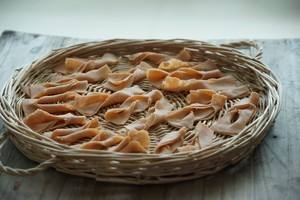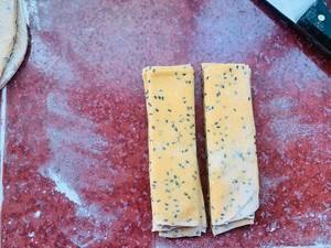接着将案板铺一点高筋粉,把面团擀成薄片,切成小长条,再对切。