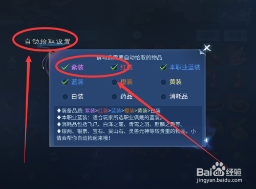 打开拾取设置面板,根据你个人需要,在装备或者物品前的小框框中进行勾选