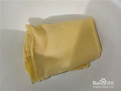 2、将豆腐皮一张一张分开,然后对折二下,叠堆起来。