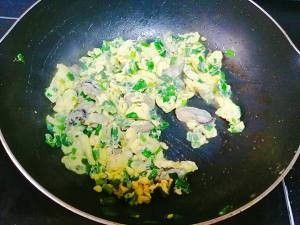 小火慢慢翻炒至鸡蛋凝结成块,出锅前淋入少许香油炒匀即可关火出锅。
