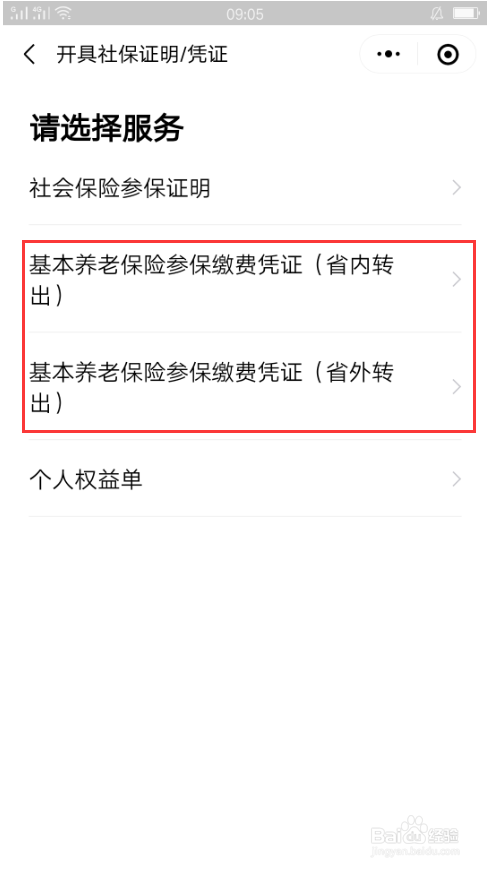 进入开具社保证明/凭证界宙菊面后,点击“养老保险参保缴费凭证种类”。