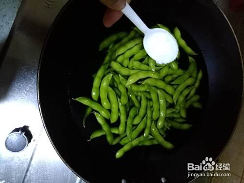 放入锅中,清水漠过毛豆就可以,加入适量的盐,稍微入味。