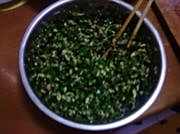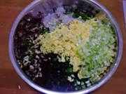 韭菜末、鸡蛋碎、香菇末、木耳末、虾泥和葱姜末混合。