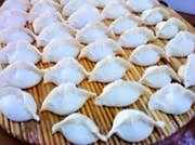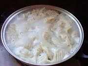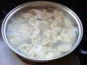 水再次烧开,点入凉水。该步骤重复3次,见饺子膨胀浮起即可。