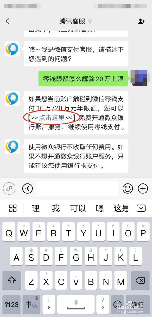 在客服咨询对话框中输入“零钱限额怎么解除20万上线”,官方回复: