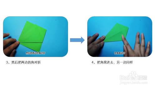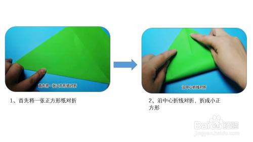 首先将一张正方形纸沿中线对折,然后按照折痕把角窝进去,翻面对折。