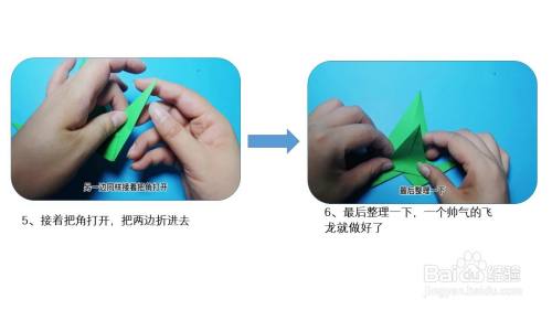 接着把角打开,把两边折进去,最后整理一下,一个帅气的飞龙就做好了。