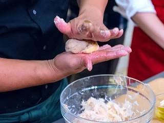 手上抹上橄榄油,取出25g蟹肉,压扁。