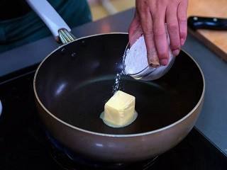 黄油和中筋面粉放入锅内,小火,炒匀。