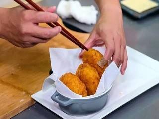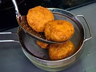 油锅继续加热至沸腾,加入可乐饼,炸至酥脆。