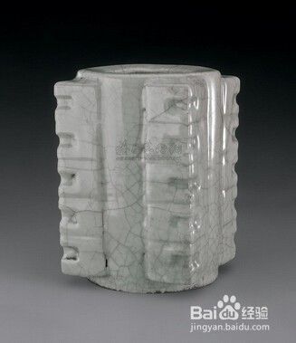 瓶口底相若,器身为玉琮式,外壁自下而上分为5节,方形,直腹,圈足,造型端庄。施灰青色釉,釉子厚润如堆脂,闪烁油光,釉面开大小不同的纹片,以黑色为主,间有金色,同时伴有冰裂纹生成,于细腻平滑中透漏着稳重典雅之气。由于此器采用垫烧法烧成,故底足一圈露胎无釉,由此可见其胎为褐色。