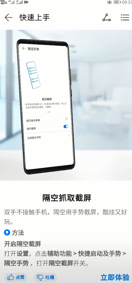 在设置中开启隔空截屏,隔空使用手势抓取屏幕,即可实现截屏。