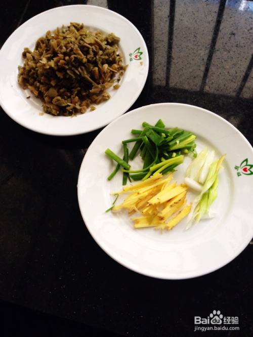 咸菜都是咸味很浓的,因此要净泡去除咸味(家里没咸菜的话用酸菜也可),咸菜梗泡去咸味后,捏干水分,切碎备用,葱姜丝切好