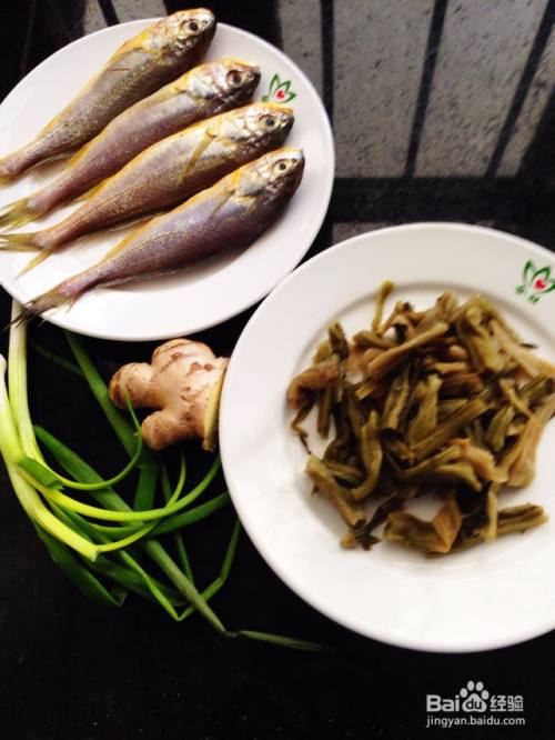 备好材料:新鲜梅鱼、咸菜梗、葱、姜
