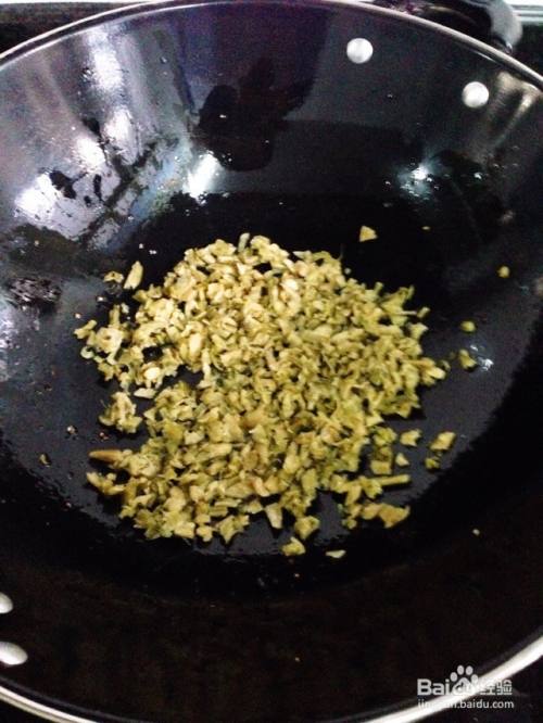 锅中倒入少许,先将切碎的咸菜用小火炒香几分钟,盛出备用