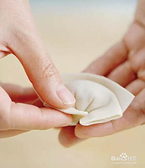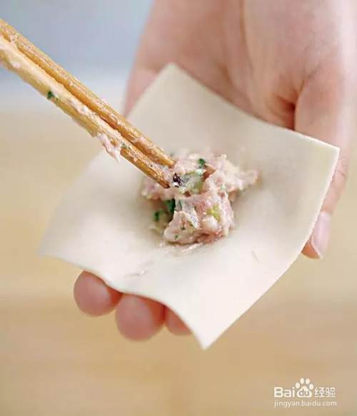 把皮两边压紧向馅中间包起来,让两边的皮粘在馄饨上