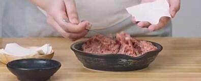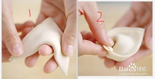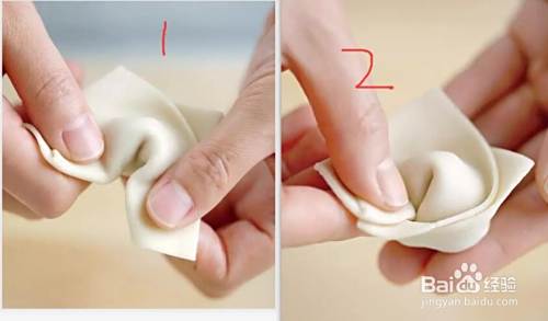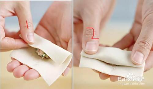 3.皮两边压紧向馅中间包起,让两边的皮粘在馄饨上