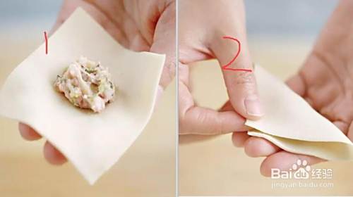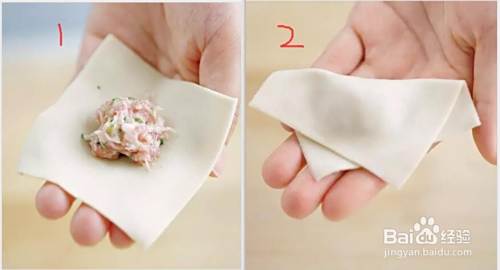 1.馄饨皮上放好馅料,将两边交错叠起来粘紧