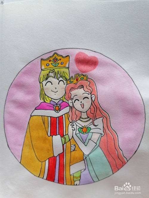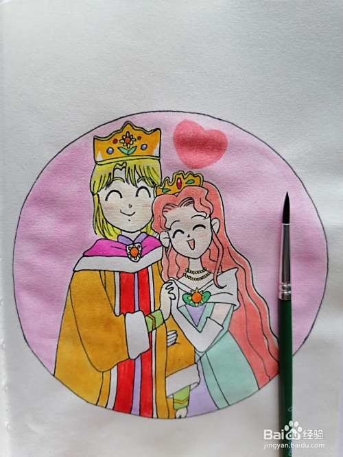 最后用土黄+白色、赭石+白色涂好两人的肤色,用玫红+白色涂好背景,再用朱红+白色画一个心形,黄金国王&猫眼石王后就画好啦