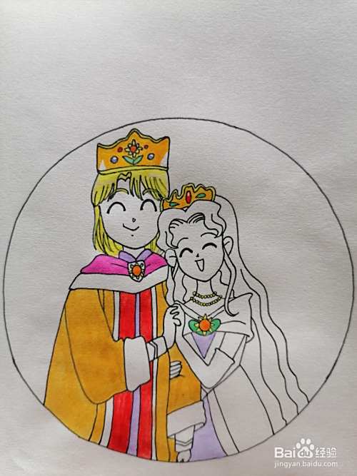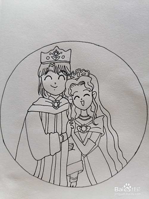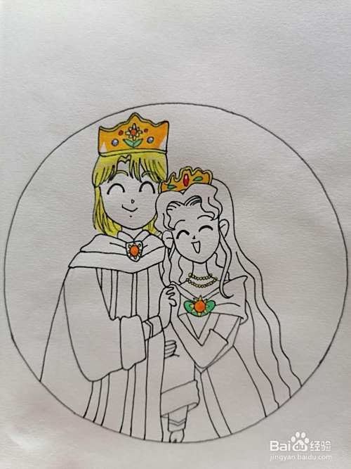 在圆的右边画出猫眼石王后的形象,两个人相互依偎在一起,表情甜蜜