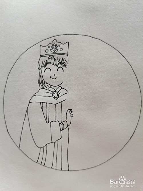 首先在纸上画一个圆,在圆的左边画出黄金国王的整体形象