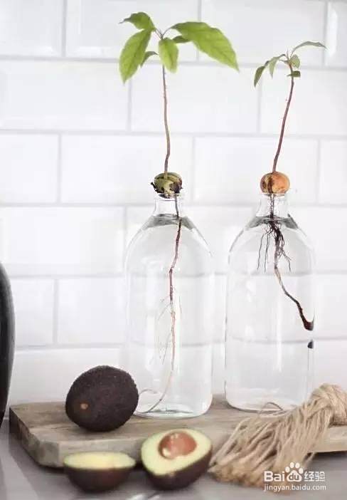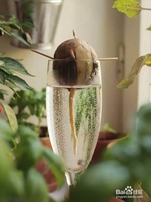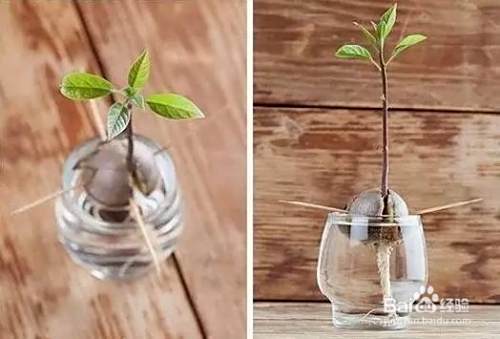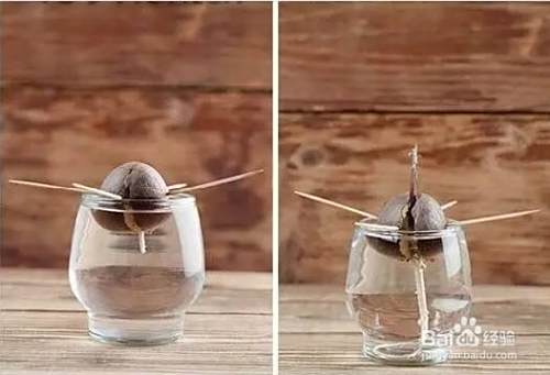 首先,将牛油果核挖出,用牙签插入果核肉中,四面各一根,放入水杯中。