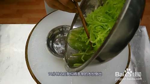 莴苣中加入食用盐一勺,搅拌均匀之后腌制10分钟,10分钟之后我们将多余的水分倒出,然后加入适量的凉开水,将去水的莴笋丝清洗干净备用。