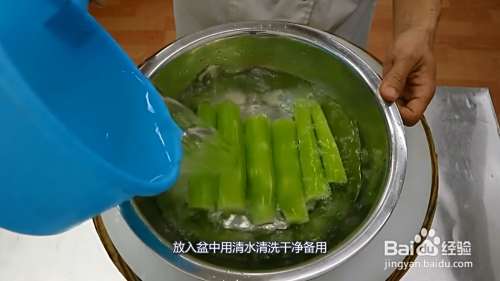 准备莴苣2根,去掉莴苣皮之后切成小段,放入盆中用清水清洗干净备用,清洗干净之后将莴笋切成细丝备用。