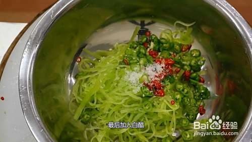 盆中加入食用盐,加入少许白糖,加入味精,最后加入白醋,搅拌均匀之后倒出即可食用。