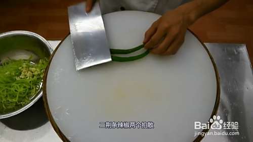 将莴笋丝倒出沥干水准备下一步腌制,准备大蒜两个拍散剁碎之后放入盆中,二荆条辣椒两个拍散,小米辣切碎。