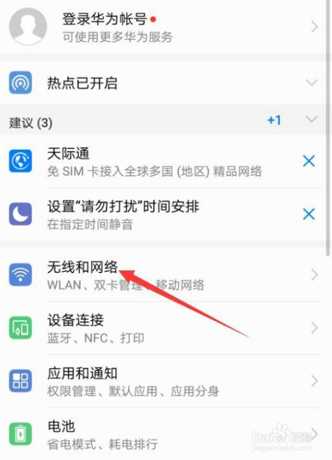 第2步,在设置功能中点击无线和网络设置,如图所示。