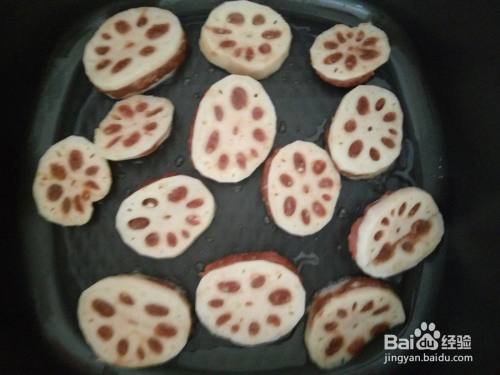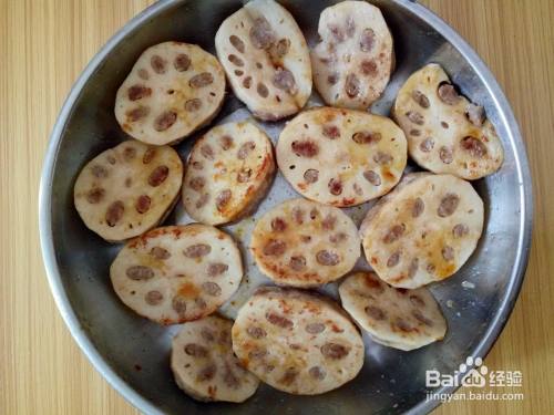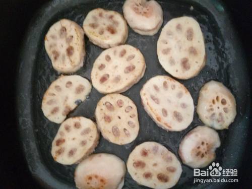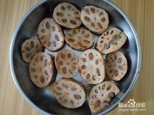 干锅下油,平铺莲藕片酿肉,小火煎至两面金黄,盛出装盘;