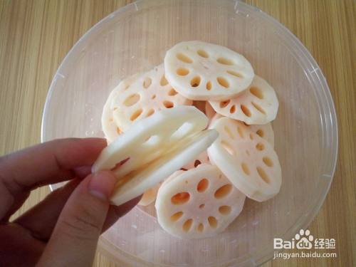 将莲藕、猪瘦肉清洗干净,干葱头除去外衣,切末待用;莲藕去皮,以一刀浅切一刀深切将莲藕切成薄片,放清水中浸泡15分钟;