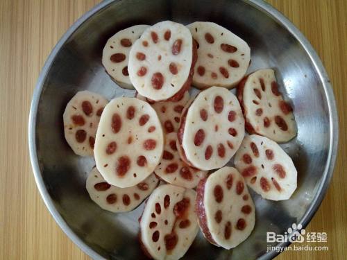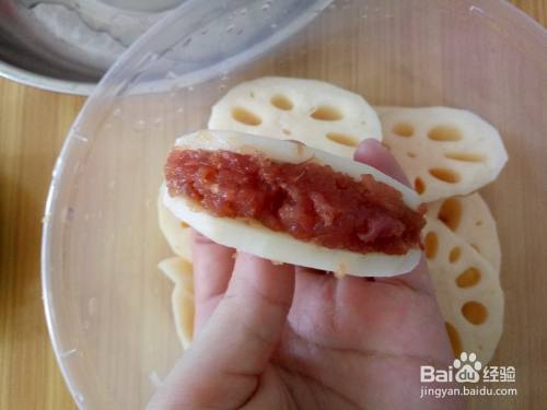 将莲藕片捞起沥干水分,用筷子把肉末塞进莲藕片中,轻压定型;